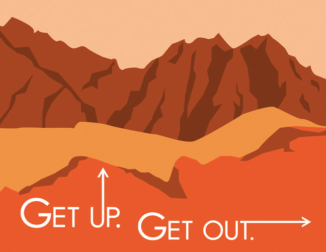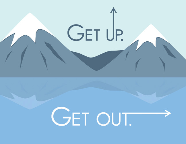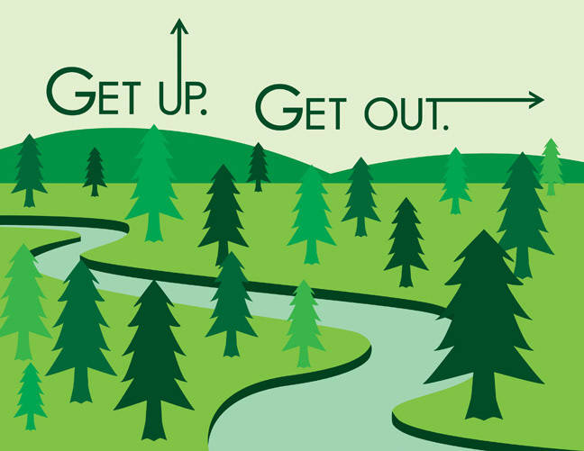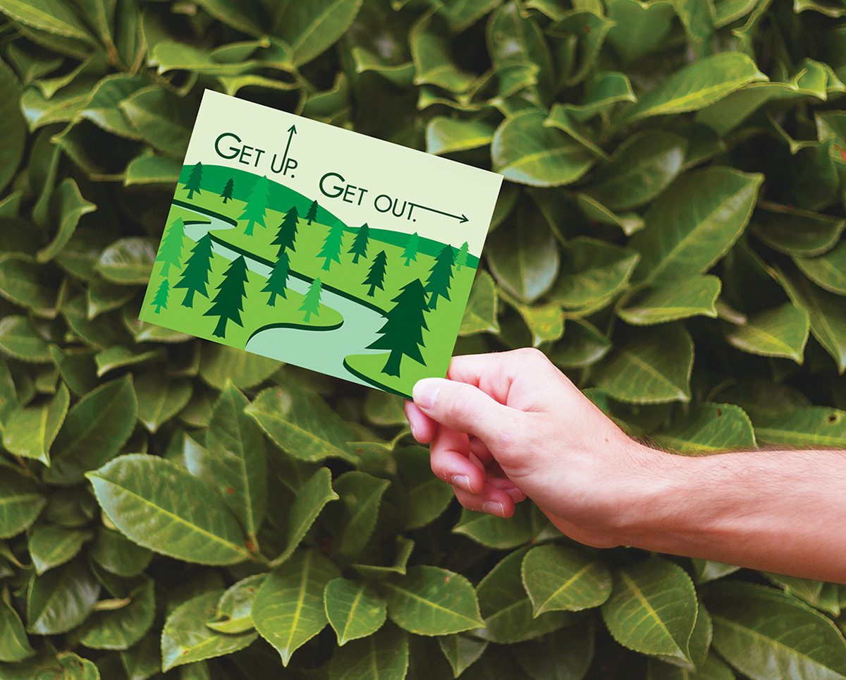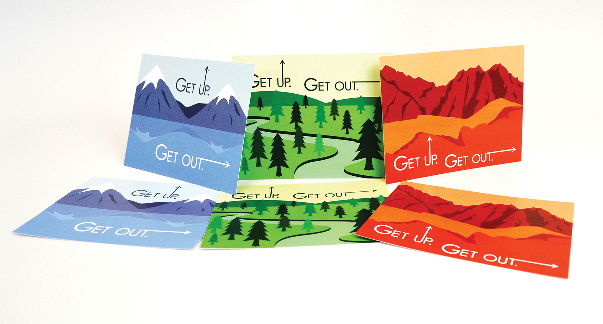 3-piece series of postcards, designed to showcase the wilderness. Each piece is a monochromatic illustration, with the tagline of 'Get Up. Get Out.' prominently displayed.