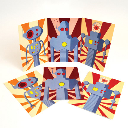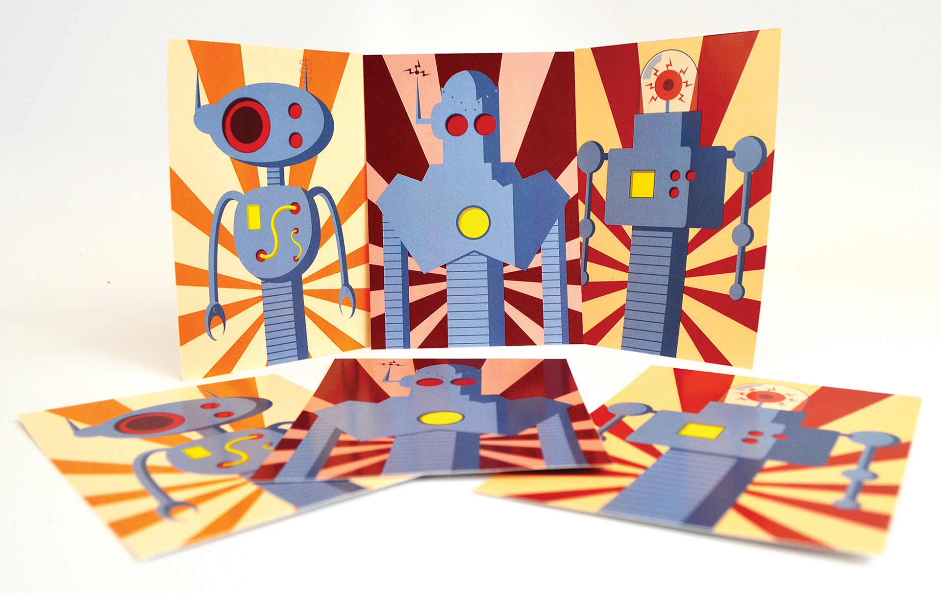 A series of post cards depicting 3 robots, designed in the ‘retro-futuristic’ style. Each began as a pencil sketch and from there, developed their own distinct personalities.